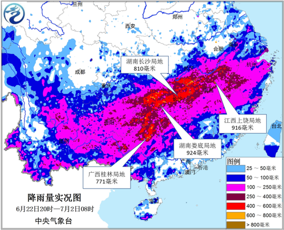 气象专家指出,此次暴雨覆盖范围广,目前已涵盖长江中下游以南的十余省(市、区),50毫米、100毫米、250毫米以上降雨覆盖面积分别为156、96、25万平方公里。此外,降雨持续时间长、强度大,截至7月2日早晨,云南东部、贵州、广西、湖南、江西、湖北东部、安徽南部、浙江中南部、福建北部等地部分地区累计雨量超过200毫米,湖南北部、湖北东南部、江西北部、广西北部等局地500~800毫米,湖南娄底局地点雨量达924毫米,广西桂林局地最大三小时雨量达150~203毫米。