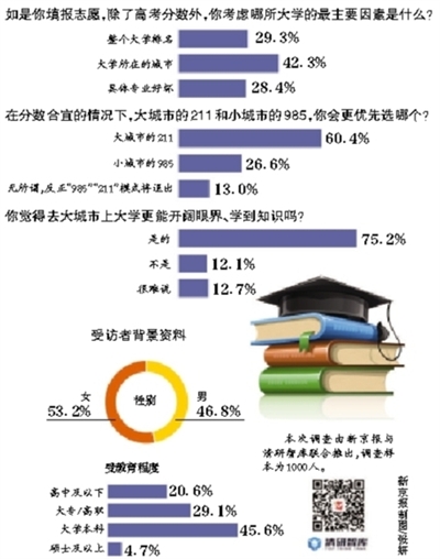 眼下,高考填报志愿时间已经开启。北上广等大城市的211和小城市的985,哪个更值得?。恳苍谕弦⑷纫?。你对此怎么看?本期“京报调查”(新京报与清研智库联合推出)就此展开调查。