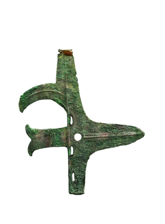 钩戟长37.7厘米,宽15.2厘米。尖端分叉,上锋较长,下锋较短,器身有三处镂孔,形状均不太规则。背部有左右相反的弯钩形装饰,下有短銎,銎上有长方形穿孔。这种形状的钩戟非常罕见,宝鸡竹园沟西周墓地曾出土一件亦有类似的钩形装饰,但区别还是很大的。结合这两处墓地的年代,这件钩戟应为西周早期的兵器。此器造型奇特,装饰风格繁琐夸张,鲜有与之相同者。陈昭容研究员认为应该不是实用器,推测或为仪仗之用。这是戴家湾墓地出土的最有特点的兵器,为研究其文化来源提供了重要线索??悸堑剿胫裨肮党鐾恋那嗤邢嗨浦?,不排除两者曾受到相同文化之影响。