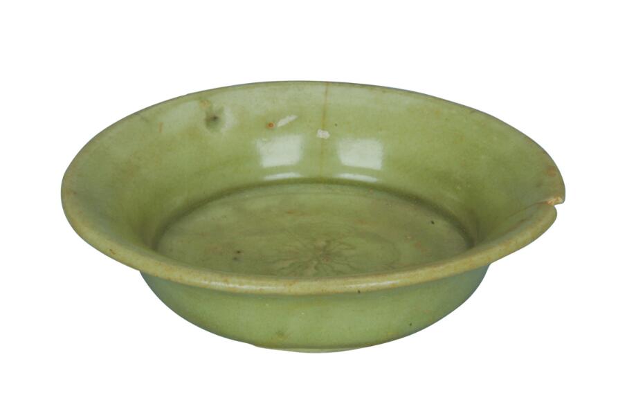 宋龙泉窑笔洗(图2),口径13厘米,底径6厘米,高4.2厘米;洗敞口、浅腹、圈足,通体施青釉,洗内底饰花卉纹。此洗胎体厚重,釉色莹润。