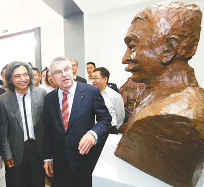 巴赫一行首先参观了中国雕塑院陈列的雕塑,对吴为山的作品赞不绝口。当看到奥运主题作品《火炬手》的实景照片时,巴赫说:“这件作品像彩虹一样,令人眼前一亮。它表现了运动员顽强的生命意志和强健的力量与速度,体现了人类丰沛的感情?!?/p>