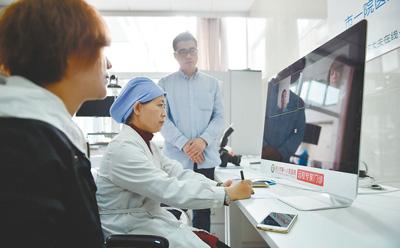 在宁夏银川市第一人民医院,医生(中)和患者(左)一起通过视频与北京的专家进行问诊。新华社记者 李 然摄
