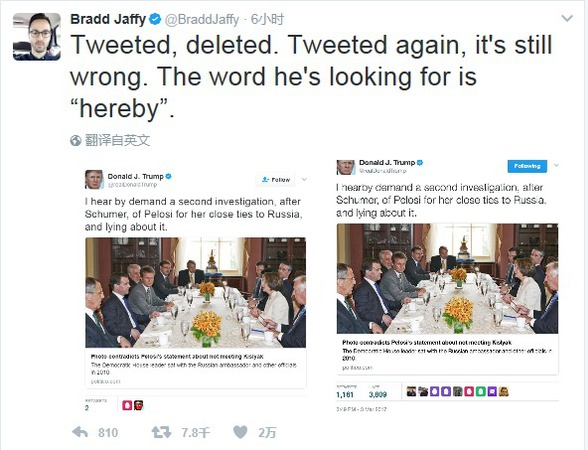 特朗普的这一错误出现后,随即被美国媒体发现,美国全国广播公司(NBC)高级新闻编辑布拉德·贾菲(Bradd Jaffy)将特朗普推特截图发出来,并配文:"发推,删除,再发一次,还是错的,他想用的单词是hereby"。