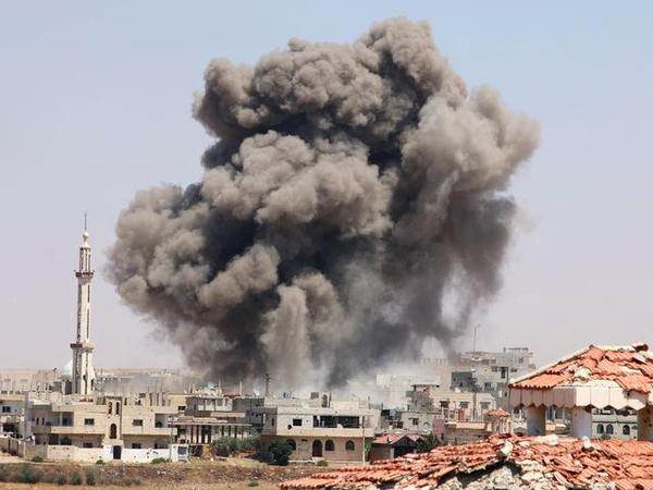 6月15日,空袭过后,德拉市一栋建筑冒起浓烟。(新华/路透)