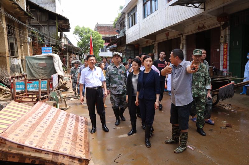 湖南省政协主席李微微(前排右二)带队在永州市督导抗洪救灾。 姚依农 摄