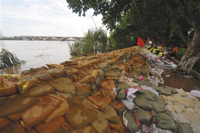 7月4日,长沙橘子洲大桥附近城区湘江沿岸用沙袋修筑的子堤。新华社记者 龙弘涛 摄
