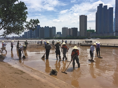 7月7日,工作人员在长沙橘子洲景区内清淤。 新京报记者 孙瑞丽 摄