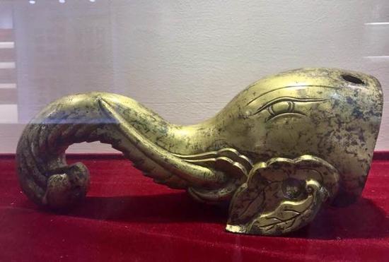 这次展览中,最为引人注目的展品是一尊鎏金铜象首。这是2014年考古队在发掘大宫门河道周边文物时,于河底淤泥中无意发现的。当这个泥疙瘩被送进实验室,经半个月清洗后,才露出了自己的“真容”。象首上有长而卷的鼻子、长牙、大耳,制作工艺考究,整体造型精巧,线条流畅自然,神态安详逼真,虽饱经风霜荡涤,但在灯光下依旧金光闪耀。
