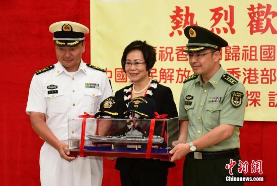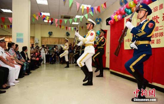 7月10日,中国人民解放军海军16舰编队与中国人民解放军驻香港部队部分官兵来到香港一间养老院慰问长者。中新社记者 徐冬冬 摄