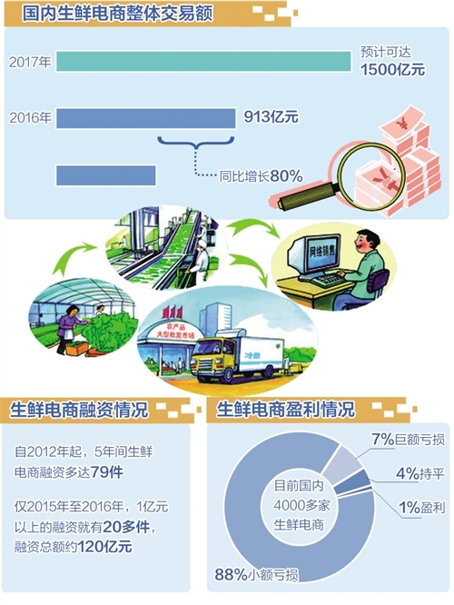 根据中国电子商务研究中心发布的《2016年度中国网络零售市场数据监测报告》,2016年国内生鲜电商整体交易额约913亿元,同比增长80%,2017年整体市场规??纱?500亿元。