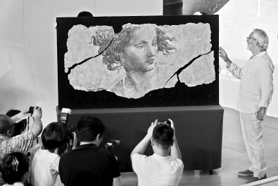 终于,一幅精美的湿壁画亮出来:一位被风吹乱短发的女神。这是策展人安东尼奥临摹的米开朗基罗《先知以西结背后的天使》,属于湿壁画。安东尼奥说:“这是米开朗基罗钟情的一种创作手法?!彼浅媚嗷彝脸笔庇醚樟辖忻杌妫嗷彝粮赏负蟊诨貌换?。文艺复兴以后,这种绘画逐渐被油画取代。