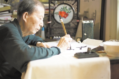 2013年6月,袁运开在师大一村寓所为华东师范大学大夏学术网题字。 吕安琪摄