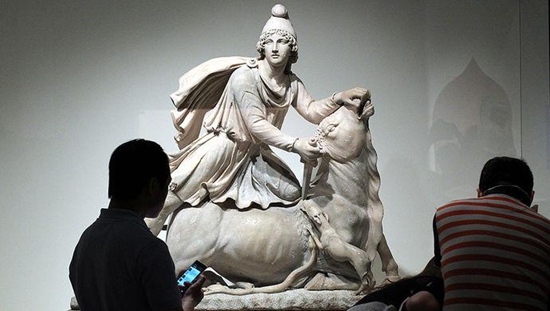 为了让观众能近距离看展,策展团队在布展过程中也是动足了脑筋,例如鸠摩罗笈多一世金币,特别采用了转动托盘的制式,让观众可以360度欣赏这枚金币,且在说明牌旁边佐以金币两面的放大局部图,让观众更清晰地观赏展品。据上海博物馆展览陈列设计部相关人士介绍,在展览的布展设计方案中融入了中国园林的“藏”和“露”,具体表现在每个区域重点展品的摆放和组合上,比如奥古斯都头像和索福克勒斯半身像,根据和大英博物馆方面的前期沟通,需要为它们设计一个相对独立的空间,摆放的时候让这两件雕像能够两两相望。