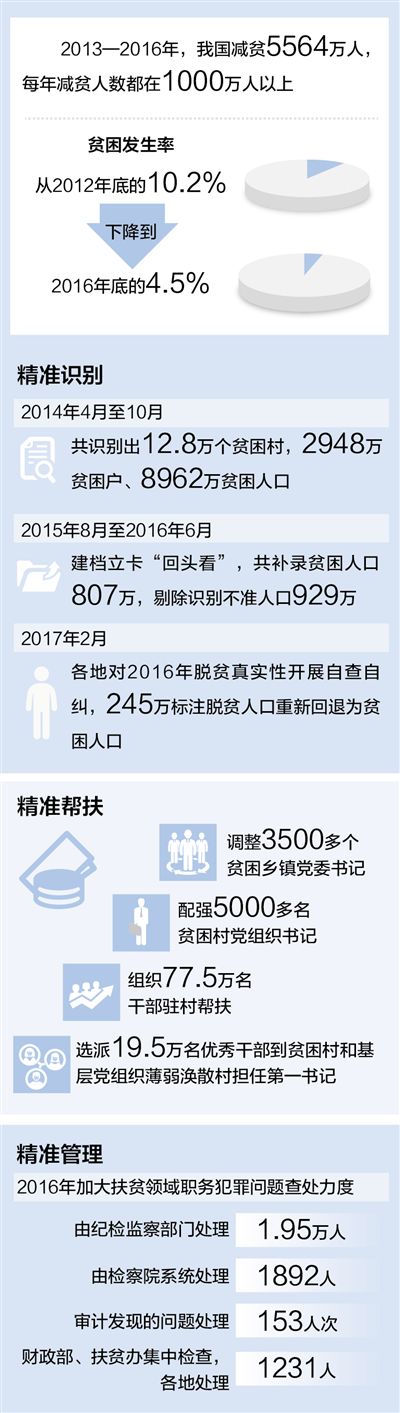 “绝不能让一个少数民族、一个地区掉队,要让13亿中国人民共享全面小康的成果?!蔽迥昀?,习近平总书记几乎走遍全国14个集中连片特困地区,精准扶贫、精准脱贫基本方略在一个个贫困山乡落地生根。2013—2016年我国贫困人口每年减少超过1000万人,累计脱贫5564万人,相当于一个中等国家的人口总量;贫困发生率从2012年底的10.2%下降到2016年底的4.5%。精准扶贫、精准脱贫的中国智慧和成功实践赢得世界点赞。在向“第一个百年目标”的奋力冲刺中,脱贫攻坚的出色成绩成为一抹亮眼的底色。