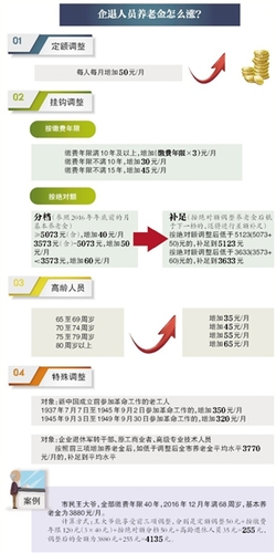 对在2016年底之前已经年满65周岁及以上的高龄退休人员,在按照上述办法调整后,再次享受到四个档次的倾斜。即65至69周岁的退休人员每人每月再增加35元;70至74周岁每人每月再增加45元;75至79周岁每人每月再增加55元;80周岁以上每人每月再增加65元。