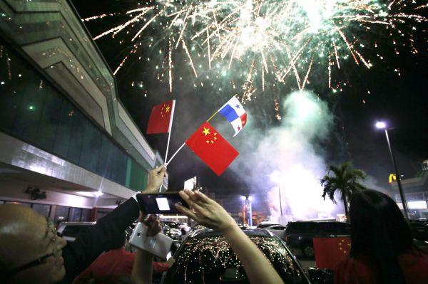 在巴拿马首都巴拿马城的华人社区,人们在巴拿马与中国建交的庆?;疃吓纳阊袒?。新华社发