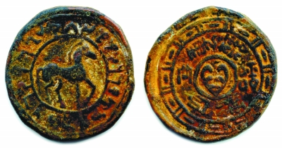 西域三十六国是丝路的必经之途,这两枚和田马钱,正是这三十六国之一的于阗国所发行的货币。这两枚正反面图案不一,但都有马的图案。最珍贵的地方是上面的双语币文,为汉字和佉卢文,小的一枚上面写着“六铢钱”的汉字,这是因为早在公元前60年,西汉政府就设立西域都护府,于阗国也就归顺了汉朝。这种和田马钱上还有希腊钱币的痕迹,它是以希腊货币为原型,仿贵霜王朝钱币打压而成。