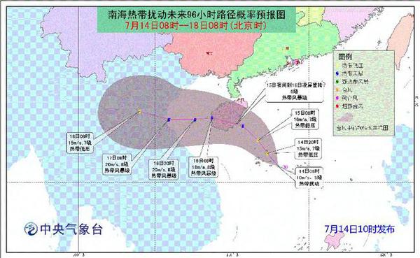 预计,扰动中心将以每小时10公里左右的速度向西北方向移动,将于今天下午到晚上加强为热带低压,并逐渐向海南东南部沿??拷?;强度逐渐增强,15日将加强为今年第4号台风(热带风暴级),并于15日夜间到16日凌晨在海南东南部沿海登陆,登陆时强度为热带风暴级(8级,18米/秒),登陆后转向偏西方向移动,自东向西穿过海南南部;16日白天进入北部湾,强度略有加强,16日夜间到17日上午将在越南东北部沿海再次登陆,登陆时为热带风暴级(8级,18~20米/秒),登陆后转向西北方向移动,在越南境内减弱消失。