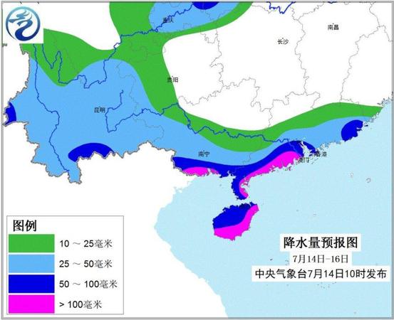 降雨方面,受热带扰动和季风的共同影响,预计14日至16日,华南及云南等地有中到大雨,其中广东沿海、广西沿海和海南等地的部分地区有暴雨,局地大暴雨,累计雨量有30~70毫米,海南局地可达100~200毫米;上述地区伴有短时强降水,小时雨强30~60毫米,局地可达80毫米以上。