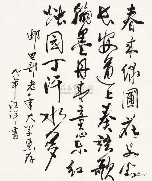 “政事儿”搜索现任国家领导人的书法作品公开拍卖纪录,2012年在上海曾有一幅汪洋的作品面世,图片显示为1998年所写,内容为“春来绿圃花为公,长安道上奏弦歌。翰墨丹青童心乐,红烛园丁汗水多?!甭淇钗坝实绮坷夏甏笱Щ荽?。九八年。汪洋书”。
