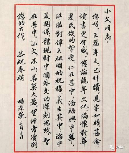 此外,国务委员杨洁篪用毛笔写的一封信,曾于2016年12月在拍卖会面世。据图片显示,杨洁篪在信中对署名“小文同志”的人,在龙年到来时致以祝福,探讨中国传统文化。