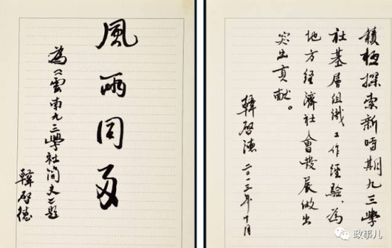 今年6月,全国政协副主席韩启德的一本签名题字的2010年学习日志,在保利拍卖会上面世。图片显示,韩启德为《云南九三学社简史》一书题字“风雨同舟”。