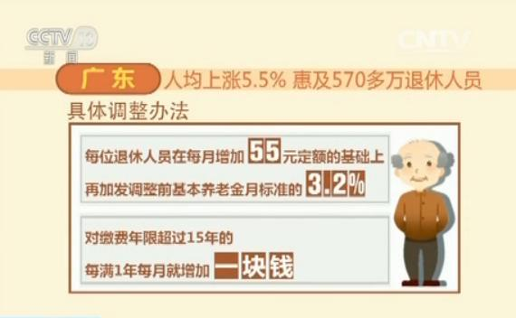 广东省基本养老金具体调整办法为,每位退休人员在每月增加55元定额的基础上,再加发调整前基本养老金月标准的3.2%,除此之外,对缴费年限超过15年的,每满1年每月就增加一块钱。年龄满年满70周岁不满75周岁的退休人员,每人每月加发50元;75周岁及以上的,每人每月加发100元。在企业退休的军转干部,基本养老金调整后如果仍达不到所在市人均水平的,按当地人均水平发放。