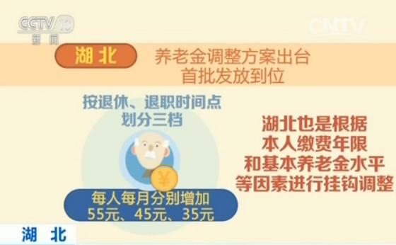 据统计,湖北有500多万退休人员符合本次调整范围。今年湖北首次实行企业和机关事业单位退休人员养老金相同的调整办法。此次调整湖北按退休、退职时间点划分三档,每人每月分别增加55元、45元、35元。同样,湖北也是根据本人缴费年限和基本养老金水平等因素进行挂钩调整。此外,湖北提出,根据国家规定范围的艰苦边远地区的企业调整对象,每人每月增加10元。