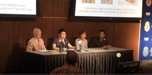 章莹颖父亲章荣高(右一)14日宣布,将提供女儿下落线索的奖金,提高到五万元。(美国《世界日报》 伊大警局直播视频截图)