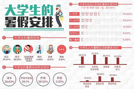 中国高校传媒联盟调查结果显示,8.51%的受访大学生选择在暑假休息,34.37%的受访大学生选择利用暑假实习或自主创业,选择备战考研或考证、参加培训班、参与科研项目等的占26.93%,18.89%的受访大学生选择参与志愿活动和社会实践,还有4.49%选择了旅行。