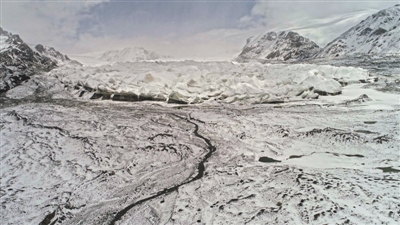 6月7日,雪后的姜古迪如冰川及冰川水融化后形成的清晰河道。长江的第一滴水,从这里流出。