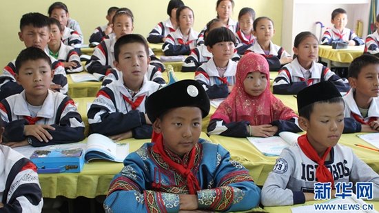 五年级二班语文老师袁琳手持《民族团结》校本教材告诉记者,每个班每周都有一节民族团结课,“前些日子回族封斋,班主任就会给孩子们讲:‘白天不要给回族同学喝水、吃东西’……”