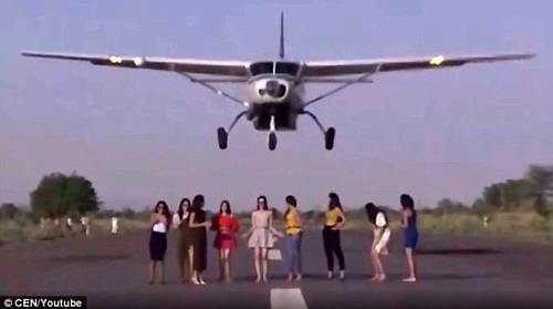 关键词:女模 跑道拍片 飞机 擦着头顶起飞