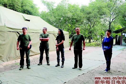 :6月15日,中国志愿者王珂、张广瑞、王伊琳、于扬和梁佳俊(从左至右)在宿营地?!⊥计尚禄绫ǖ涝背卵徘偕?/p>
