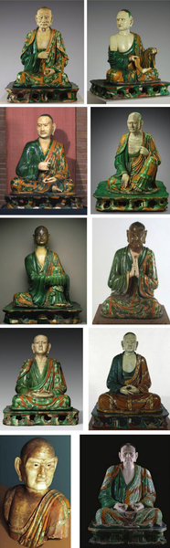 现收藏于各大博物馆的10尊易县三彩罗汉像。从左到右、从上到下分别收藏于美国大都会艺术博物馆(老)、大都会艺术博物馆(年轻)、美国宾夕法尼亚大学考古学及人类学博物馆、美国波士顿美术馆、加拿大皇家安大略博物馆、日本现代美术馆、美国纳尔逊艾金斯艺术馆、大英博物馆、俄罗斯冬宫、法国吉美博物馆。