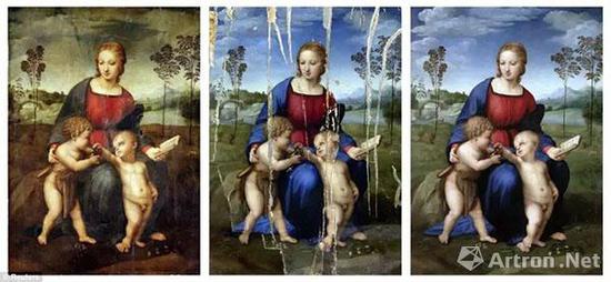 让人感慨的是,最近在这幅画的老家佛罗伦萨Uffizi博物馆即将展出的不再是古老的复制品,而是历经10年用高科技手段修复成功的真品!画里,圣母玛丽、幼儿受洗约翰和耶稣构成规则的几何图形——一个几乎等腰的三角形,但没有影响三人自然的姿态。圣母玛丽手拿一本书象征智慧;受洗约翰手中的金翅雀象征耶稣将要承受的十字架酷刑,约翰是在向耶稣警示他的命运。