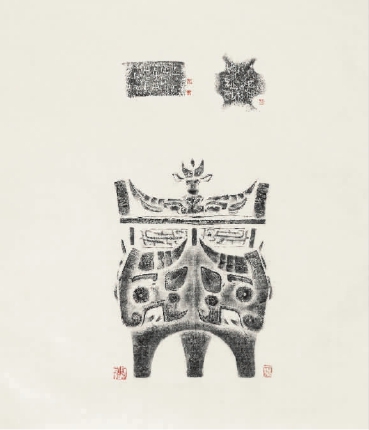 “传拓”俗称拓片,若要对青铜器器形进行传拓,就必须采用全形拓的方法。全形拓是一种以墨拓作为主要手段,将古器物的立体形状复制表现在纸面上的特殊传拓技法,又名“立体拓”“器形拓”“图形拓” ?!昂诳萍肌钡牟厝挥懈龃担合啻寮吻炷昙?,苏州焦山寺有一尊青铜鼎,寺僧六舟和尚秉烛赏鼎,发现墙上映出鼎的影像。他灵机一动,把原器的尺寸量好画出轮廓,再以厚纸做漏子,用极薄六吉棉连纸扑墨拓,这样青铜器爱好者们不用登门也能见识鼎的形象。这种拓前需先用白芨水刷在器物上,再用湿棉花上纸,待纸干后,以绸包棉花拓印额形式,就是全形拓。它要求拓技者具备熟练的素描、绘画、裱拓、传拓等技法,把器物原貌转移到平面拓纸上的一种特殊技艺。一时间,全形拓工艺成为潮流,无数文人墨客、金石学家都沉浸在全形拓的乐趣中,金石学家阮元还邀六舟和尚将家藏青铜器全部制成全形拓,而全形拓也为他们欣赏研究青铜器提供了非常难得的材料。