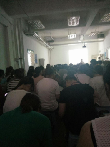 李月正在接受培训的房间,不足150平米挤满300人。(图片由受访者提供)