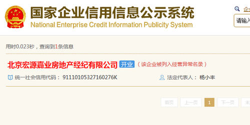 另外,记者在国家企业信用信息公示系统发现,中介公司宏源嘉业目前处于经营异常状态。