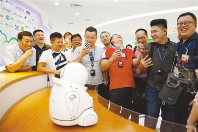 7月11日,参加北京线活动的华裔杰出青年代表在中关村软件园与智能机器人开心互动。 韩海丹摄