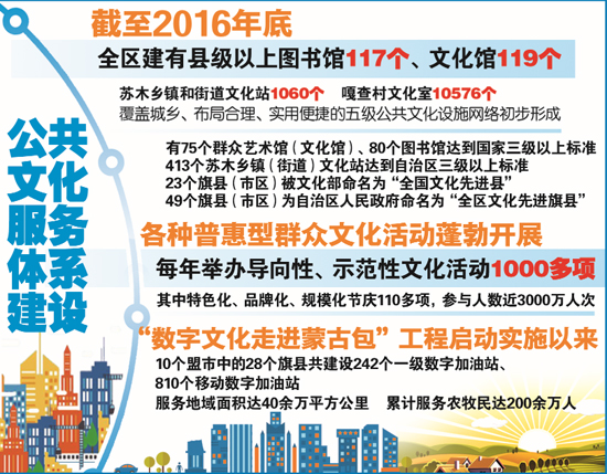 自治区第十次党代会提出,要完善公共文化服务体系、文化产业体系和文化市场体系,推动基本公共文化服务标准化均等化发展。近年来,自治区高度重视公共文化服务体系建设,一系列关于公共文化服务体系建设的政策措施出台,一系列重大公共文化服务项目投入实施,有力保障了人民群众的基本文化权益。