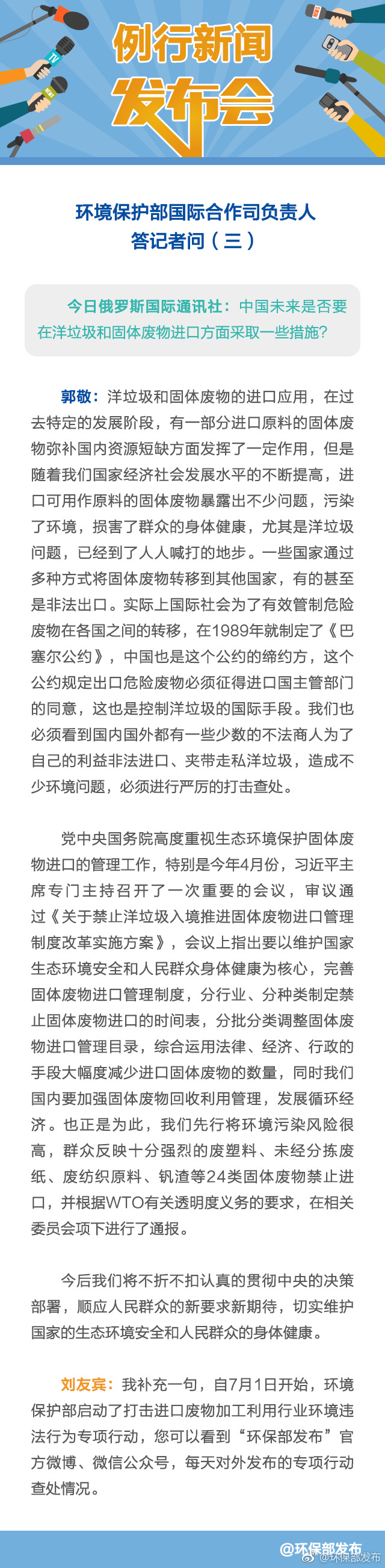 中新网7月20日电 今天上午,环境?;げ烤傩?月份例行新闻发布会?;嵘希攵浴爸泄蠢词欠褚谘罄凸烫宸衔锝诜矫娌扇〈胧钡奈侍?,环保部国际合作司司长郭敬表示,必须看到国内国外都有一些少数的不法商人为了自己的利益非法进口、夹带走私洋垃圾,造成不少环境问题,必须进行严厉打击查处。