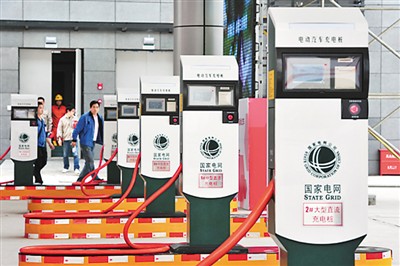 据《日本经济新闻》报道,中国正在推动纯电动汽车的普及,销量实际上在世界范围位列第一。图为电动汽车充电桩。(资料图片)