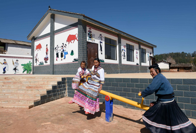 ▲脱贫了的禄劝中屏镇芹菜塘村苗族妇女和孩子在村史馆休闲广场玩耍。新华社资料照片