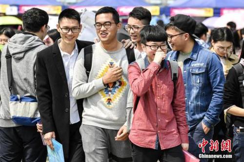 资料图:招聘会上,大学生们笑谈面试经历。中新社记者 陈骥旻 摄