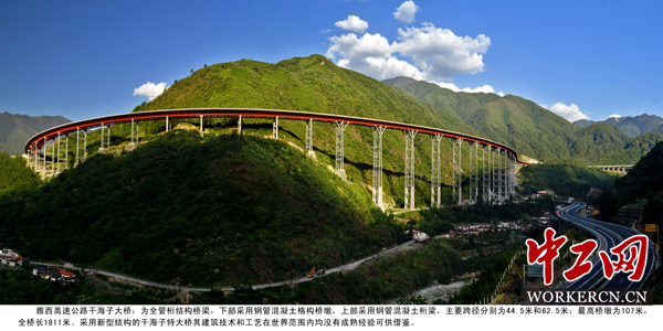 干海子特大桥建成即创造了4个世界第一。如今,雅西高速公路已安全运营多年,特别是经受住了“4.20芦山大地震”的检验,充分证明了新型钢管混凝土桥梁技术的先进性。
