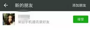 陌生人发出添加好友,点开通讯录,再点开“新的朋友”,出现好友添加请求列表,在人像姓名下直接显示:“来自通讯录好友”。