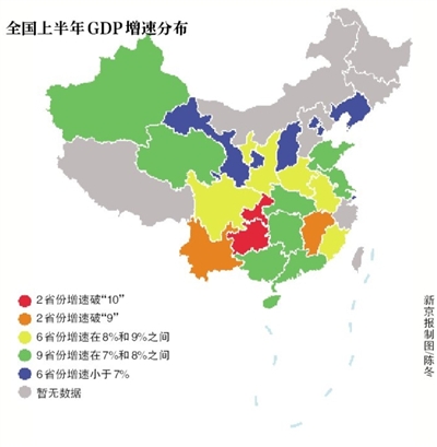 与全国6.9%的GDP增速相比,已公布数据的省份中有19个省份上半年GDP增速跑赢“国家线”。剩下的6个省份中,天津、上海和山西与“国家线”持平,北京、甘肃和辽宁分别比“国家线”低0.1、1.9和4.8个百分点。