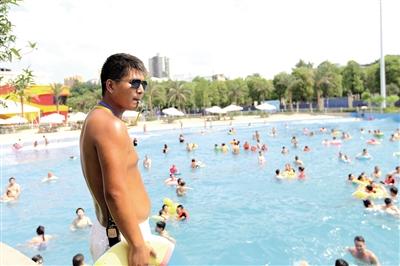 “园内有冲浪池、大滑板、大喇叭、竞赛滑梯、极速坠落、漂流池、按摩池等水上娱乐设施?!毙斐纱┳哦炭悖髯拍?,踩着一双人字拖,在医务室喝了几口水,跟记者聊了几句,就急忙走向冲浪池?!跋挛?点有一场冲浪,会聚集很多人,我得好好看着。”徐成说。