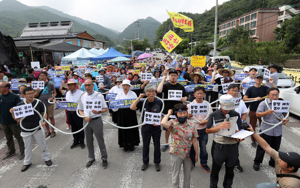 当地时间2017年7月30日,韩国星州郡, 当地民众集会抗议部署“萨德”。据韩联社报道,朝鲜于28日晚发射导弹后,韩国总统文在寅随即主持召开国家安全保障会议全体会议,指示部署剩余4辆“萨德”发射车。